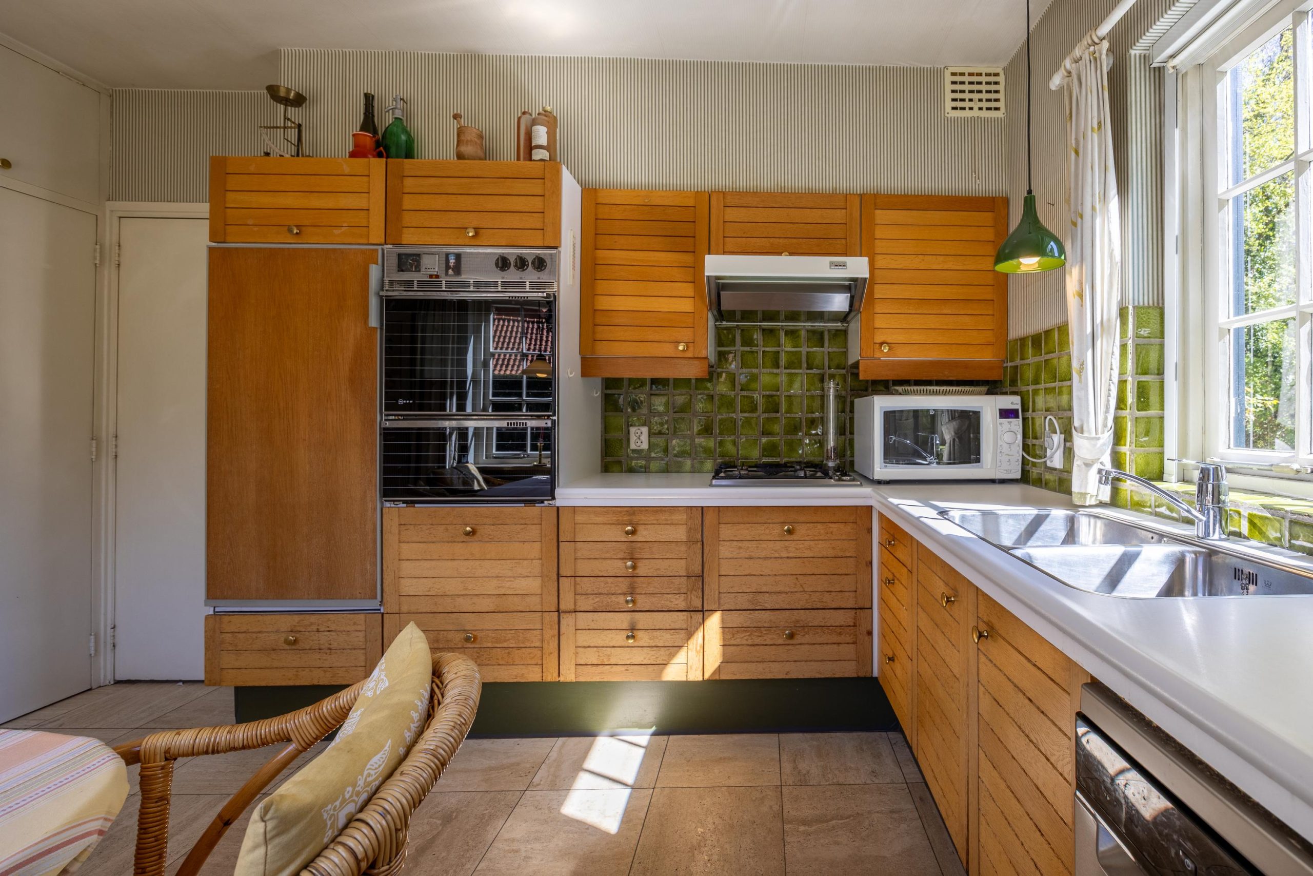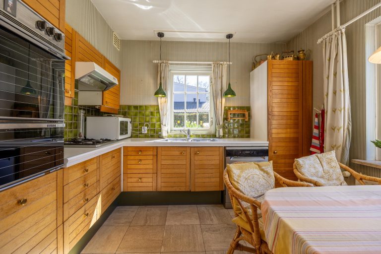 De keuken is uitgerust met een koelkast, twee ovens, een gasfornuis met vier pits, een dubbele spoelbak, vaatwasser, afzuigkap en diverse inbouwkasten. Vanuit de keuken is het terras in de achtertuin bereikbaar.