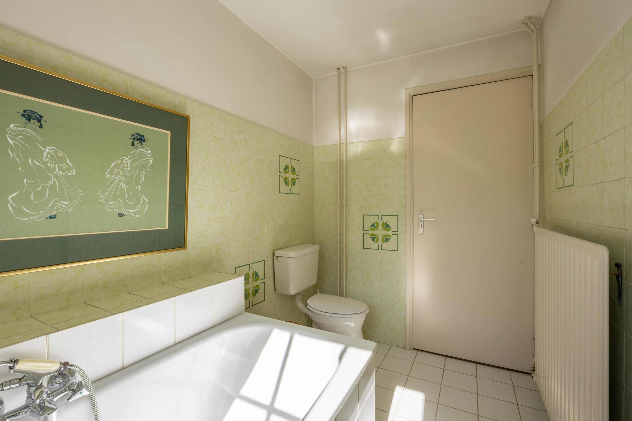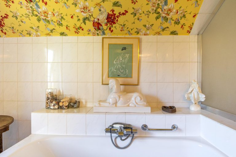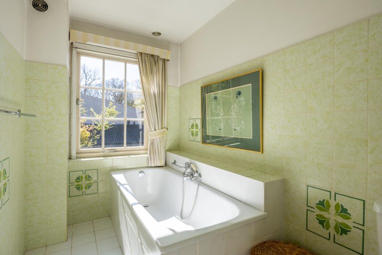 Deze badkamer is volledig betegeld en voorzien van een ligbad, douche, separate toiletruimte en een dubbele wastafel.