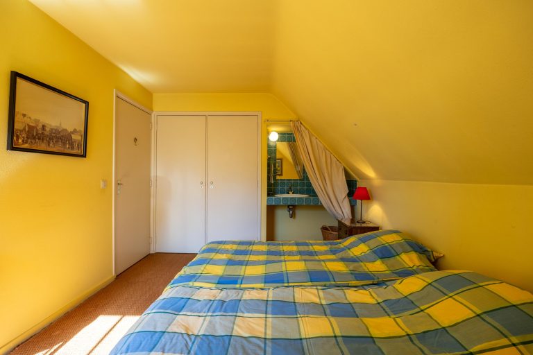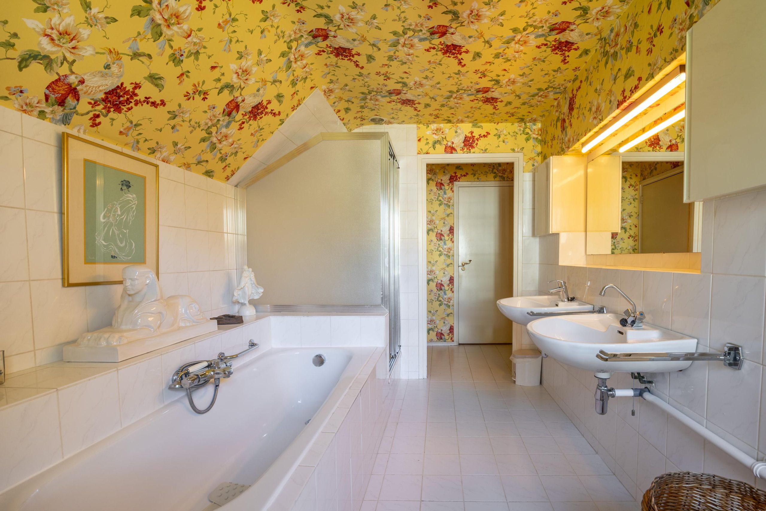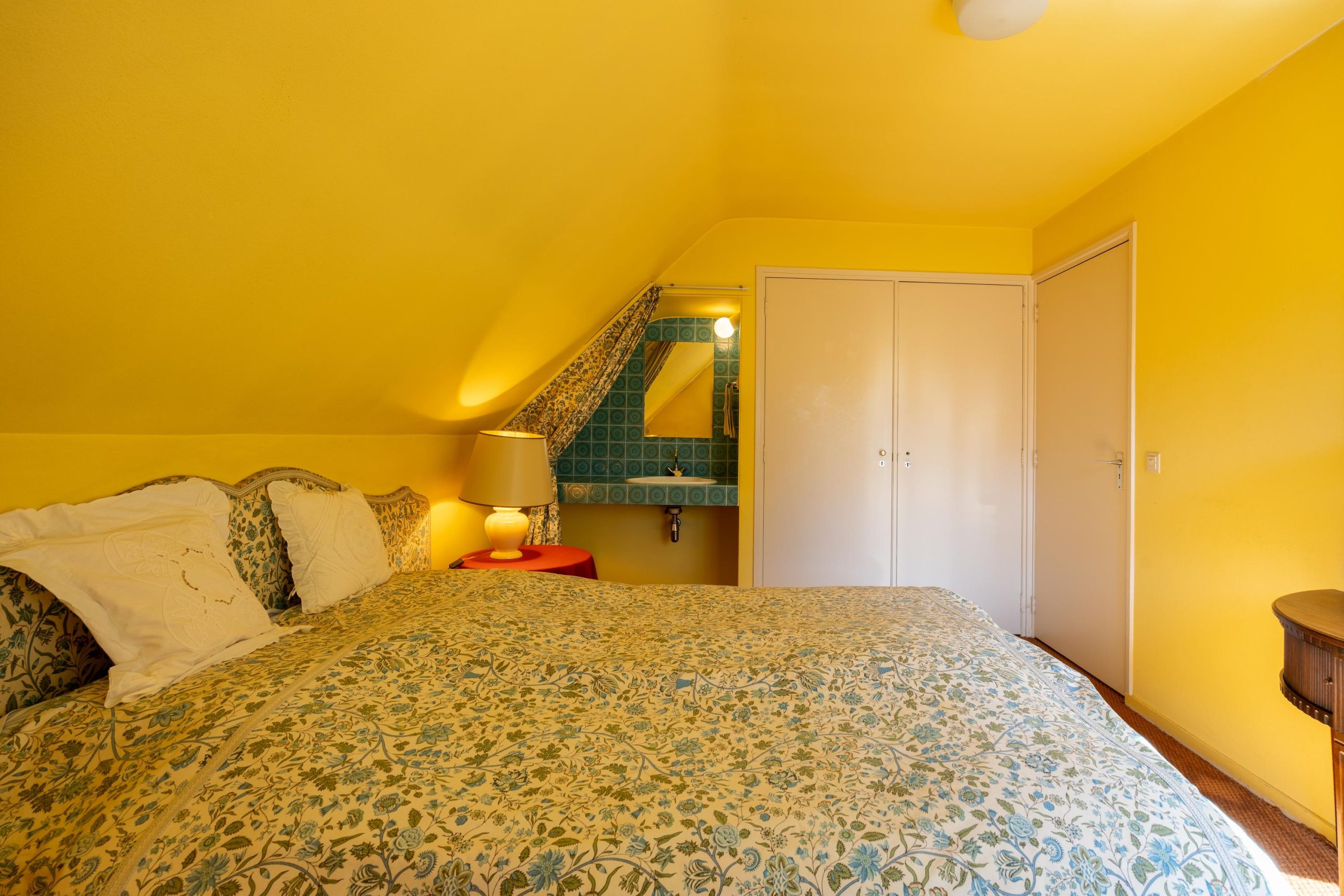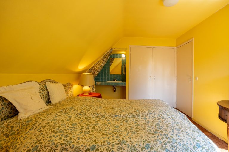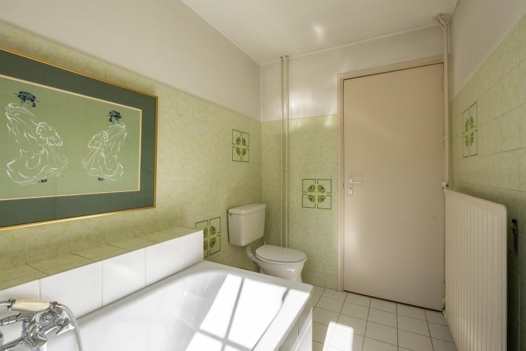 Twee slaapkamers beschikken over een wastafel en inbouwkasten. Tussen deze slaapkamers is een badkamer gesitueerd, volledig betegeld en voorzien van een ligbad, toilet en wastafel.